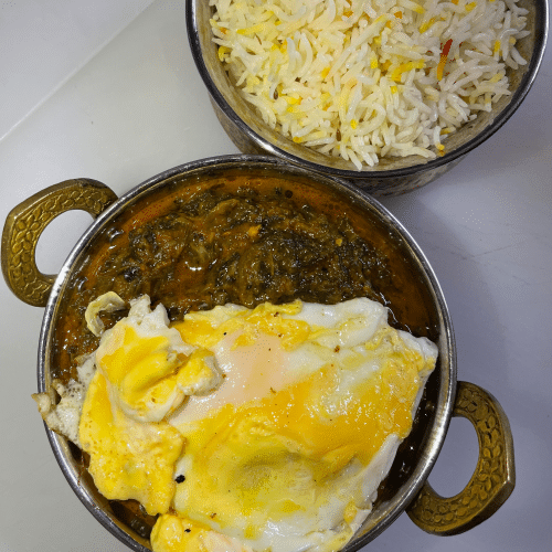 Spinazie en eieren bereid in een smaakvolle, kruidige tomatencurry en gereserveerd met rijst