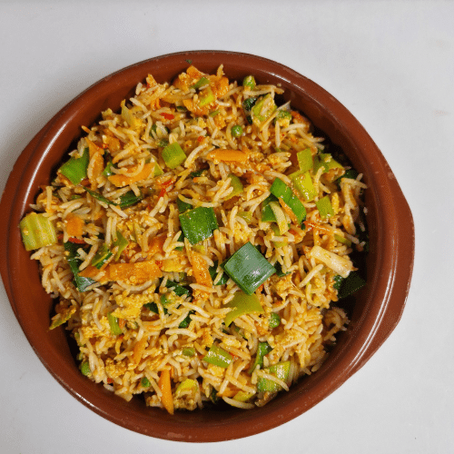 Een heerlijk en smaakvol Indo-Chinees gerecht gemaakt met perfect roergebakken rijst, ei en een mix van knapperige groenten zoals wortels, prei, vrede en meer. Licht gekruid en vol van smaak